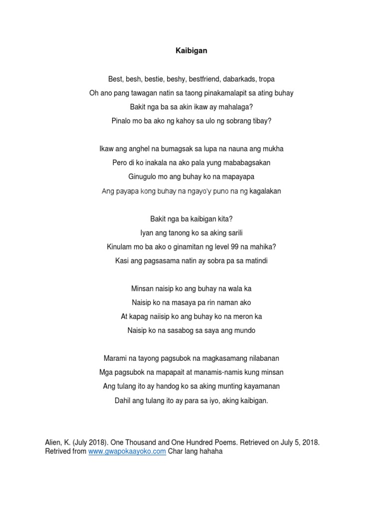 Tulong nilay lagi kong dama. Kaya kaibigan Itoy tanggapin mo -. 4 Mga Kaibigan5 Naniniwala ako sa iyo Mga kaibigan na6 Mga video para sa mga maikling kaibigan Mga Tula.