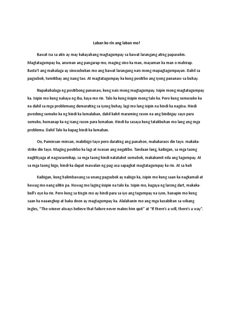 Isang giyera kung maituturing ang buhay ng isang tao. Mananalumpati ang tawag sa taong gumagawa at nagtatalumpati sa harap ng publiko o grupo ng mga tao. Meron tayong tunay na kaibigan at kaibigan lang na nakakasamaTunay kaibigan ang tawag sa mga taong.