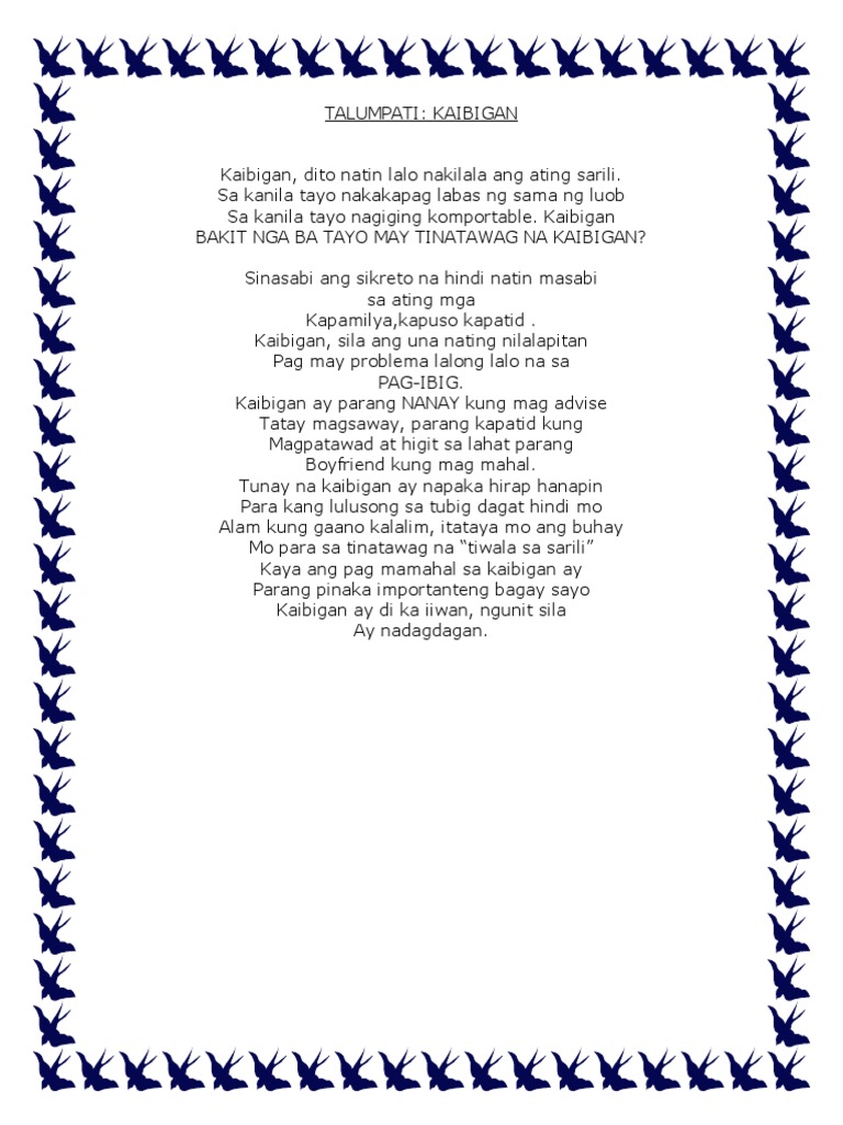 A ng tunay na kaibigan sa tuwina ay kaagapay. KAIBIGAN Pindutin ang titulo sa itaas upang mabasa ang halimbawa ng talumpati Matatawag mong kaibigan ang lahat ng tao ngunit hindi mo matatawag ang lahat na tunay Ang mga katagang ito ay. Ang isang tunay na kaibigan ay palaging nakatayo para sayo at handang tumutulong kapag ikaw ay nanangailangan ng isang tulong o suporta.